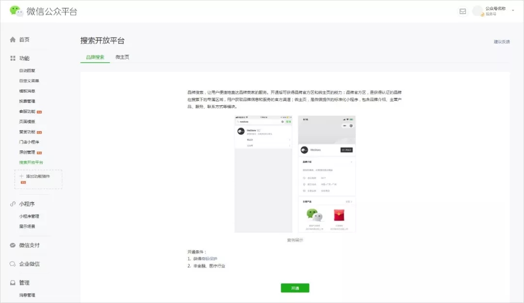 公众号获得商标保护及非金融、医疗行业的商家就可以开通品牌搜索了。完成品牌官方区和微主页的配置并通过审核,品牌搜索即可生效。用户打开“搜一搜”或“小程序”,搜索品牌名称就能直达服务了。